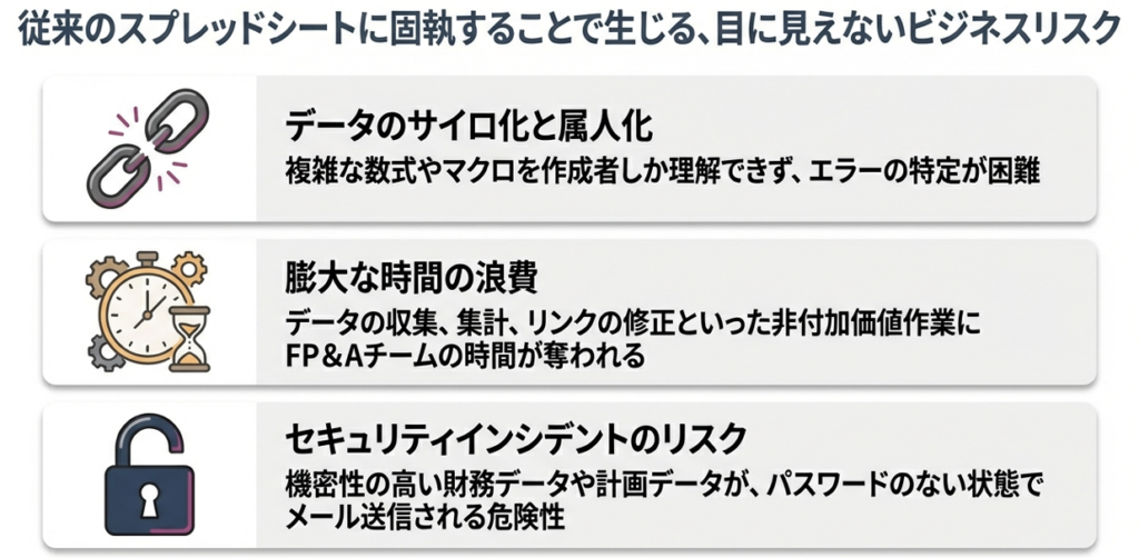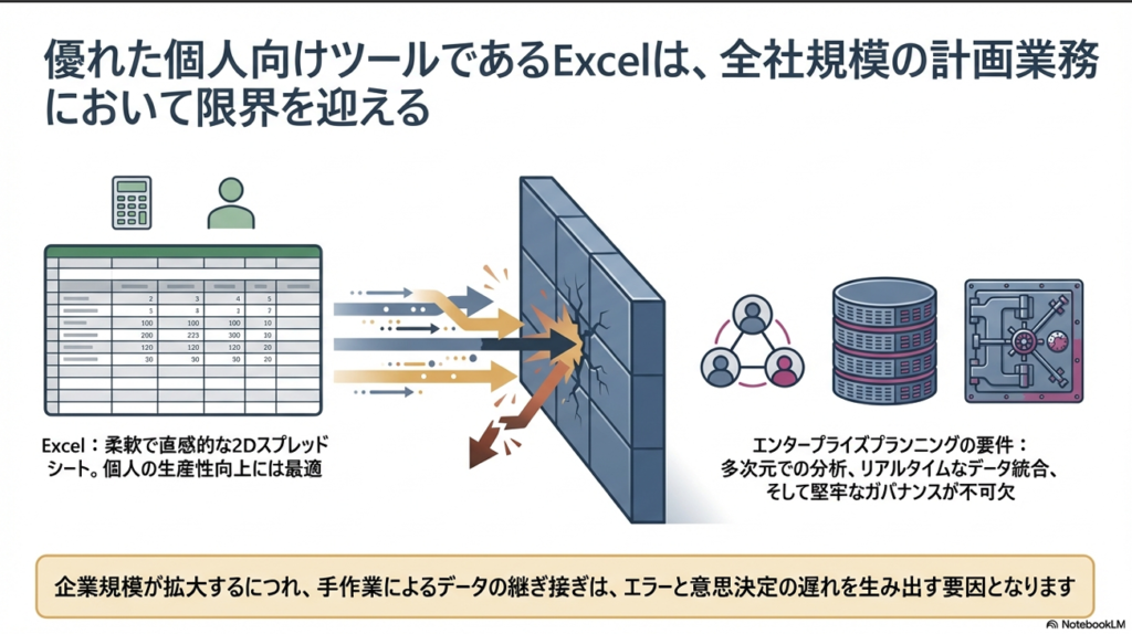 Excelは柔軟で直感的に操作できるので、個人的に使うにはとっても便利で素晴らしいツールです。でも、会社全体で計画を立てようとすると、手作業でデータをくっつけるうちにミスが起きたり、時間がかかって意思決定が遅れたり…いわゆる「限界の壁」にぶつかってしまいます。