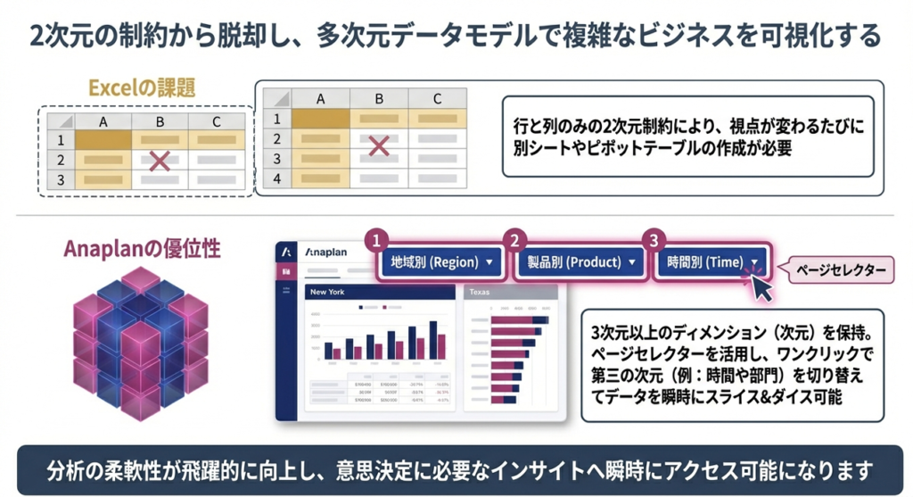 Excelは縦と横(行と列)の2次元なので、見方を変えるたびに新しくシートやピボットテーブルを作らなきゃいけないですよね。Anaplanなら「地域別」「製品別」「時間別」など、3次元以上のデータを持てるので、ページセレクターという機能を使ってワンクリックでサッと切り替え、瞬時に分析できちゃいます。