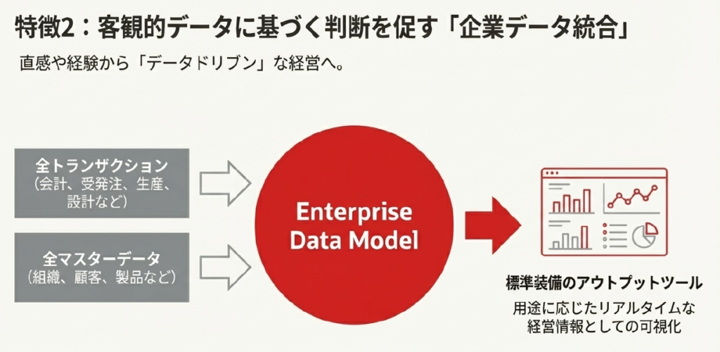 会計、受発注、生産、設計などのトランザクションデータから、組織や顧客などのマスターデータまで、企業活動の全てを統合したデータモデルを保持しています。標準装備のアウトプットツールを使えば、リアルタイムな経営情報として用途に応じた形式で確認することができます。