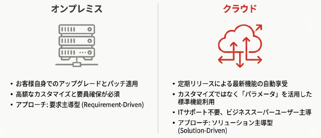 クラウド環境は従来のオンプレミスとは全く異なります。従来の「要件定義で必要な機能を洗い出し、不足分は追加開発(カスタマイズ)する」という要件主導型(フィット&ギャップ)のアプローチでは、追加開発が増加し、せっかくのクラウド導入の目的が失われてしまいます。