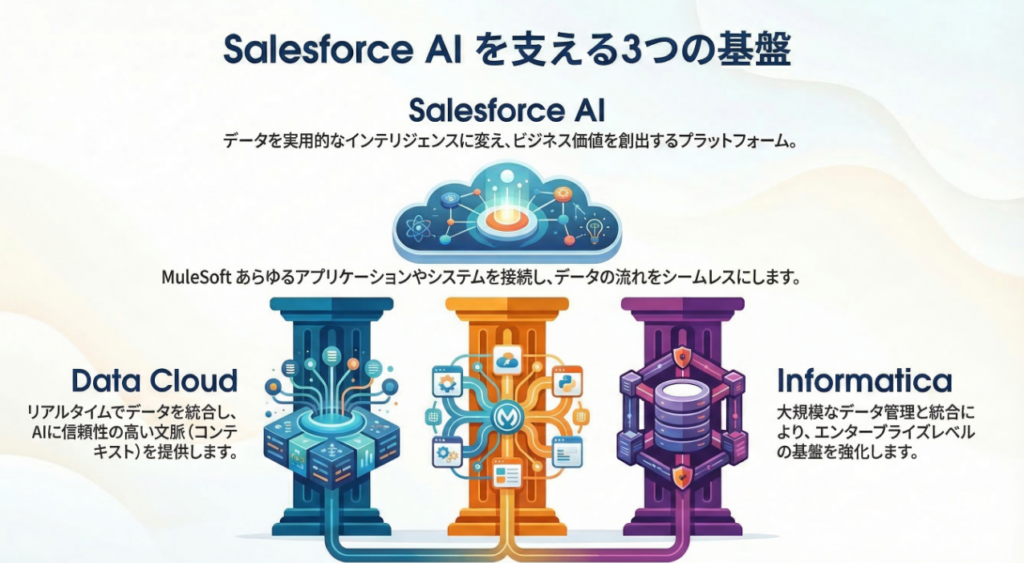 この構成から見えてくるSalesforceの最終目標は、単なるCRM企業からの脱却です。「Data Cloud」「MuleSoft」「Informatica」という強力な3本柱を揃えることで、「AI時代の最強データプラットフォーム企業」への進化を目指しているといえると思います。これは、企業のあらゆるデータを一手に握り、次世代データ覇権戦争を勝ち抜くための強力な布石だと言えます。